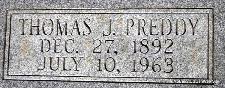 Research Note: His wife was Beulah Sanders. Son of Frank Preddy and Haidee Linville. Bob Preddy of Cassville, MO was the informant on the death certificate. - January 27, 1917, Cassville Democrat - Leonard Mitchell has purchased the interest of Tom Preddy in the Star Theater. - Cassville Republican, June 13, 1918 - Tom Preddy has a new machine and everything up in good condition for his moving picture shows at the Opera House. He will appreciate your patronage. - Cassville Republican, Aug. 28, 1919 - Attempted Hold Up: Two men attempted to hold-up Tom Preddy Friday night as he went home after the moving picture show which Mr. Preddy conducts at the Opera House. He frequently goes to and from his home by a back ally leading south from Main street and did so Friday night. A short distance before reaching home two men confronted him and demanded that he hold up his hands. He turned and ran toward town and called for City Marshal Wolfenbarger. Later R. H. Barber left the cafe for his home in the same part of town knowing of the attempt to hold up Preddy carried a gun along with him and discovering a man near his home he fired a t him. At the same time another man was seen by Wolfenbarger to be running across the field toward the creek. - Cassville Republican, Oct. 30, 1919 - Will Nickell, Tom Preddy and Paul Mattingly are at work on the erection of a wireless receiving station here. These men declare that they will soon be ready to receive news by wireless. | Death Certificate Online Newspapers Phyllis Long Photo Darla Marbut |