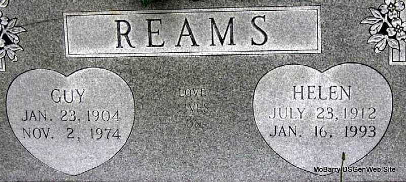 | REAMS, Guy | Jan. 23, 1904 | Nov. 2, 1974 | SSW: Helen - Inscription: "Love Lives On" - Research Note: Son of George W. Reams and Minerva Belle Hefley. - February 15, 1917, Thursday, Cassville Republican - Washburn Prairie: Guy and Joe Reams of Pasley visited at the home of their uncle, Chas. Hefley and family Saturday night and Sunday. | Census Online Newspapers Phyllis Long Photo Darla Marbut |