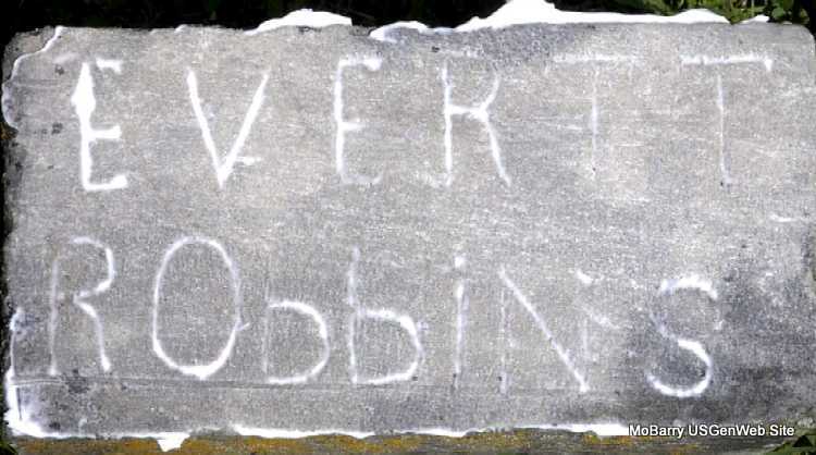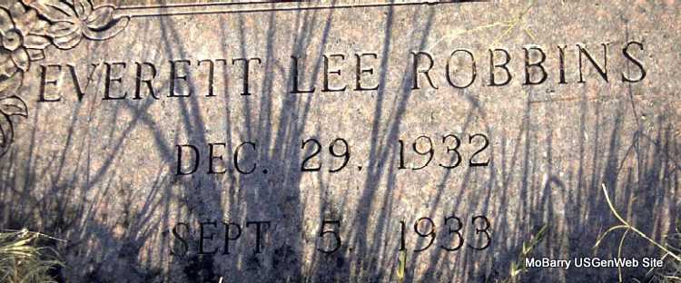 | ROBBINS, Everett Lee | Dec. 29, 1932 | Sept. 5, 1933 | Research Note: Homemade stone. Son of Nina Luceil Robbins, father unknown. Nina was the daughter of George Cornelius Rinehard Robbins and Ida Belle Garner. She married M. J. Kipps and is buried in Horner Cemetery under Kipps. - Another Stone | Census Phyllis Long Photo Darla Marbut |
