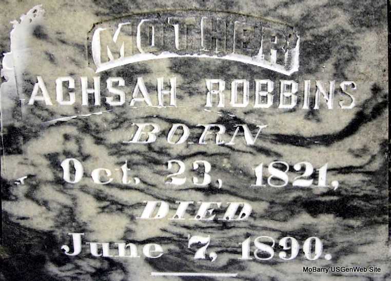 | ROBBINS, Achsah (HOBSON) | Oct. 23, 1821 | June 7, 1890 | Inscription: "Mother" - Research Note: Wife of John Harvey Robbins. Achsah Hobson, born 1821 IN, married John Robbins, born 1817 IN, in 1844 in IN. Researchers say she was the daughter of Michael Hobson and Mary Wells. | U. S. Marriage Records Phyllis Long Photo Darla Marbut |