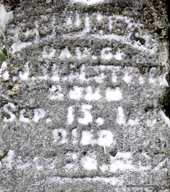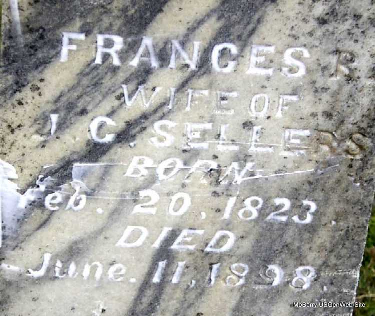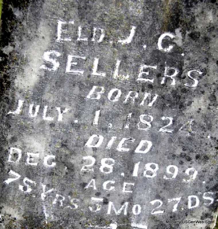 Inscription: "Aged 75 Yrs, 5 MO, and 27 DS" - Research Note: On December 21, 1848, Ooltewah, Hamilton Co., TN, Frances Reagan and James Calvin Sellers were married. He was a son of Sampson and Mary (Cowan) Sellers. The 1999 transcription had for the inscription: "Holy Bible - At Rest" - Cassville Republican, Jan. 4, 1900 - Forest Grove News: We feel sad over the loss of J. C. Sellers but feel sure it is not a loss to him but gain. For years he had been moving to the Sprit, therefore he shall reap life everlasting. Obituary: Sellers: Died, Thursday, Dec. 28, 1899, at 6:30 p.m., James Calvin Sellers, aged 75 years, 5 months and 27 days. With the passing of Elder J. C. Sellers disappears one of the pioneers and most prominent members of the Baptist church of Barry County. Since the organization of the Barry County Association sixteen yeas ago he had continuously presided as moderator and assisted in the institution of many churches over the county. He was one of the founders of the First Baptist Church of Cassville, organized on Saturday before the first Sunday in June 1883, and also Cassville NO. 2. James Calvin Sellers was born in Hamilton Co., Tenn., near Ooltewah, July 1, 1824, where he married Frances Reagan, Dec. 21, 1848. About 1862 he moved to Benton Co., Ark., where he was a neighbor of M. C. Messer's parents, and shortly after came to Barry County, settling on White River. In 1856-7, he taught school on Kings Prairie and among his pupils were Mr. and Mrs. Geo. M. Goodnight of Cassville and Houston Marbut of McDowell. While living on White river he had charge of the Easley ferry and after the battle of Pea Ridge moved to Springfield. In 1868, he returned to this county, locating on the place where he died, four miles southeast of Cassville. In 1874-5, he was superintendent of the public schools of this county and in 1878 he was elected county treasure on the Democrats ticket. He was one of the charter members of Pythagoras Lodge, A. F. and A. M. of this place. Services were conducted at Horner Church, Saturday by Eld. J. C. Sills after which interment occurred in Horner Cemetery. | Note Donna Cooper Online Obit Phyllis Long Photo Darla Marbut |