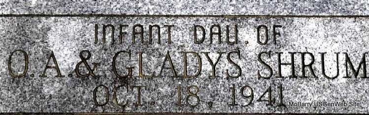 | SHRUM, Infant | Oct. 18, 1941 | Oct. 18, 1941 | Inscription: "Infant Dau. of O. A. and Gladys Shrum" - Research Note: Daughter of Orville Shrum and Gladys Brown. | Family Records Phyllis Long Photo Darla Marbut |