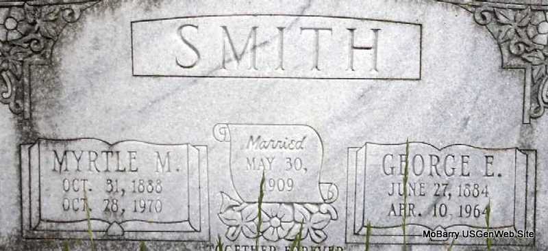| SMITH, George E. | June 27, 1884 | Apr. 10, 1964 | SSW: Myrtle M. - Inscription: "Married May 30, 1909" - Research Note: Son of George Washington Smith and Sarah Towler. Maybe this George: January 16, 1913, Thursday, Cassville Republican - George Smith was brought down from Monett Saturday by Sheriff Brixey and is being held in his charge until the fine and cost is paid in the case charging Smith with gambling. Smith was convicted of this charge about two years ago in the justice court of Monett and later in the circuit court of the county. An appeal was taken to the court of appeals in which court the case was lately dismissed. | Online Newspapers Census Phyllis Long Photo Darla Marbut |