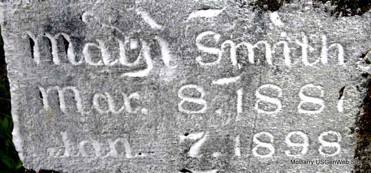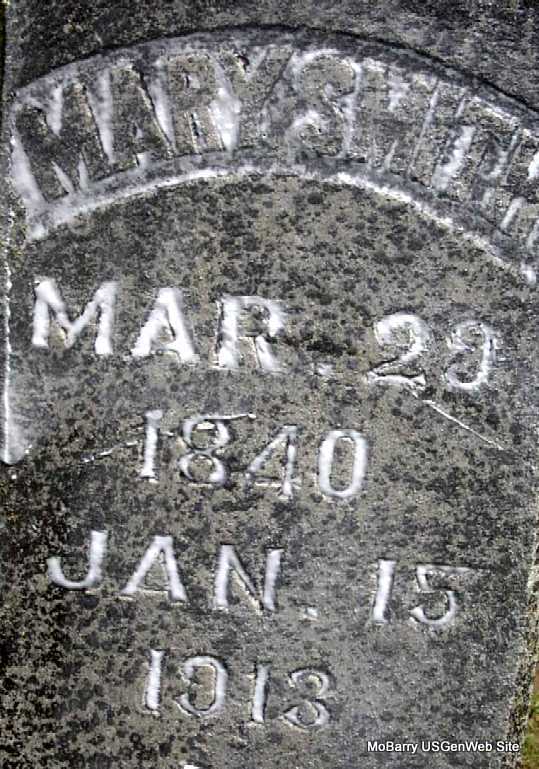 Research Note: His wife in the 1880 Census is Elizabeth, age 60. Second wife was Mrs. Mary Moore. - August 21, 1909, Saturday, Cassville Democrat, Barry Co., MO - Thomas Smith, aged about 80 years, died at his home on Rock House in Mineral Township, Thursday of general debility, after an illness of about two months. "Uncle Tommy" Smith as he was known, was born in East Tennessee, and had been a resident of Barry County for a number of years and was well known by all the old timers. He leaves a wife and two sons, Robert Smith of Oklahoma and Jas. Smith of Mt Vernon to mourn his death. He was married twice, marrying Mrs. Mary Moore, mother of Frank Moore of near town, the second time. His wife and son James were at his bedside when he died. Funeral services were held at the Horner Cemetery Friday afternoon at four o'clock by Rev. Wesley Ennis after which the remains were laid to rest in the Horner Cemetery. One by one the old timers are called to the great beyond and it will be but a short time until they have all passed over the other side. We extend our sympathy in their sad hour of distress. - Obit for Mary, second wife of Thomas Smith: March 24, 1910, Thursday, Cassville Republican - March the 11th at 5:25 a.m. the death angel visited our home and took our mother, Mrs. Mary Smith, wife of Thomas Smith and mother of Frank S. Moore. She was the daughter of Prier Bradley, was born in East Tennessee in 1845 and came with her parents to Barry county when she was six years old and had lived in Barry County ever since, except a few years in Dade County. She professed her faith in Christ when young and joined the Cumberland Presbyterian Church and lived in that faith until her death. She had been afflicted for about seventeen years and could not attend church as she would have liked to do. She leaves three brothers and one sister and one son to mourn her death. Their loss is her gain. She died of heart trouble and dropsy and bore her affliction with patience and was ready to go. She was living at her son's and all was done that loving hands could do but Jesus said, it is enough, come up higher, where there is no more sickness nor goodbyes. Rev. J. W. Ennes conducted the funeral services at the house and we laid her to rest in the Oak Hill Cemetery to await the resurrection morn. | Online Newspapers Note Census Darla Marbut |