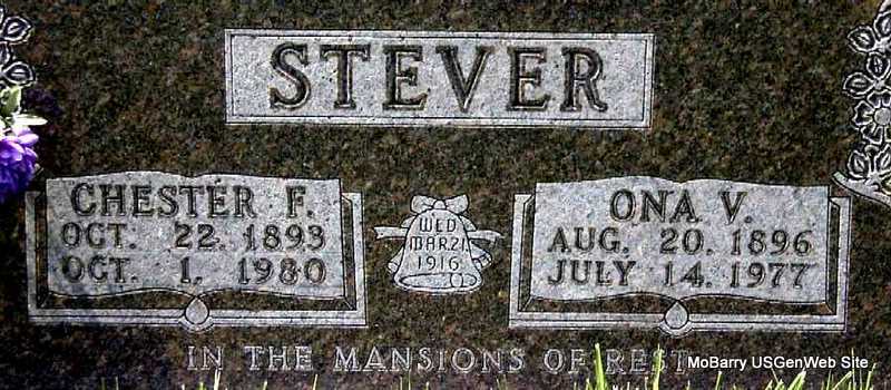 | STEVER, Chester Floyd | Oct. 22, 1893 | Oct. 1, 1980 | SSW: Ona V. - Inscription: "Married March 21, 1916 - In the Mansions of Rest" - Research Note: Son of George Stever and Belle Frances Humphrey. - Cassville Democrat, June 26, 1920 - Mr. and Mrs. Floyd Easley and children spent Sunday at Chester Stever's near Golden. - Cassville Democrat, August 14, 1920 - Chester Stever and family of Golden spent Sunday at E. B. Holman’s. | Online Newspapers Phyllis Long Photo Darla Marbut |