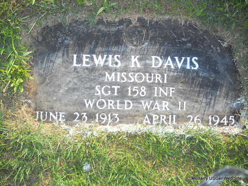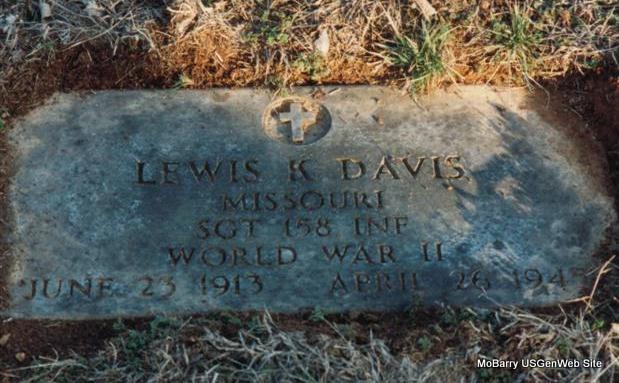 | DAVIS, Lewis Kelly | June 23, 1913 | Apr. 26, 1945 | Inscription: "Missouri, SGT 158 Inf - WW II" - Research Note: Son of Steven Elbert Davis and Rhoda Orlean West. Killed in WW II on Luzon. - Another Photo | Note Photo Shelda Davis Kempton Photo Donna Cooper Ted Roller |