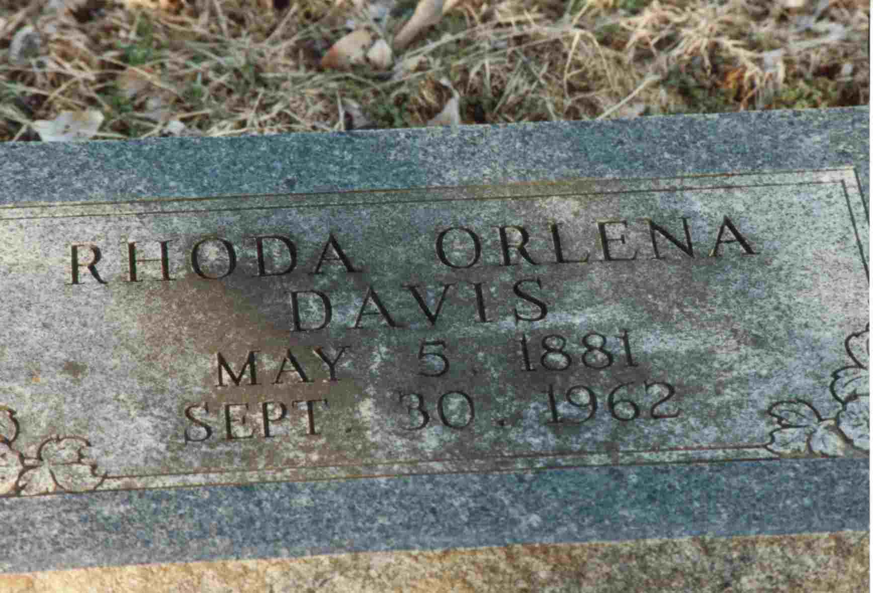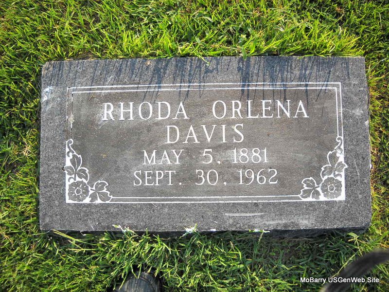 | DAVIS, Rhoda Orlena (WEST) | May 5, 1881 | Sept. 30, 1962 | Research Note: Rhoda Orlena (West) Davis was my grandmother. She married Steven Elbert Davis and were parents of 1.) Mary Lucinda Davis Ratliff 2) Eligh Garrett Davis who married a Blanche Marie King 3) Elbert "Bert Davis 4.)Lewis Kelly Davis who was killed during the war on Luzon. 5) Carrie Juanita Davis who married Ralph Franklin Hull. She was very active in eastern Star and civic matters in Monett. - Daughter of Joseph West, mother's name (Rhoda Kelley) not given on the death certificate. Mrs. Ralph Hull of Monett, MO was the informant. - Orlena West married S. E. Davis on June 9, 1901 in Newton Co., MO. - Another Photo | Photo Shelda Davis Kempton Death Certificate Phyllis Long Photo Donna Cooper Ted Roller |