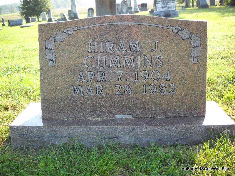 | CUMMINS, Hiram J. | Apr. 7, 1904 | Mar. 28, 1982 | Research Note: He is buried next to Hettie M. Cummings, his sister. Son of Elmer Rudolph Cummins and Anna May Carpenter. | Headstone Jack Delmar Census Phyllis Long Photo Donna Cooper Ted Roller |