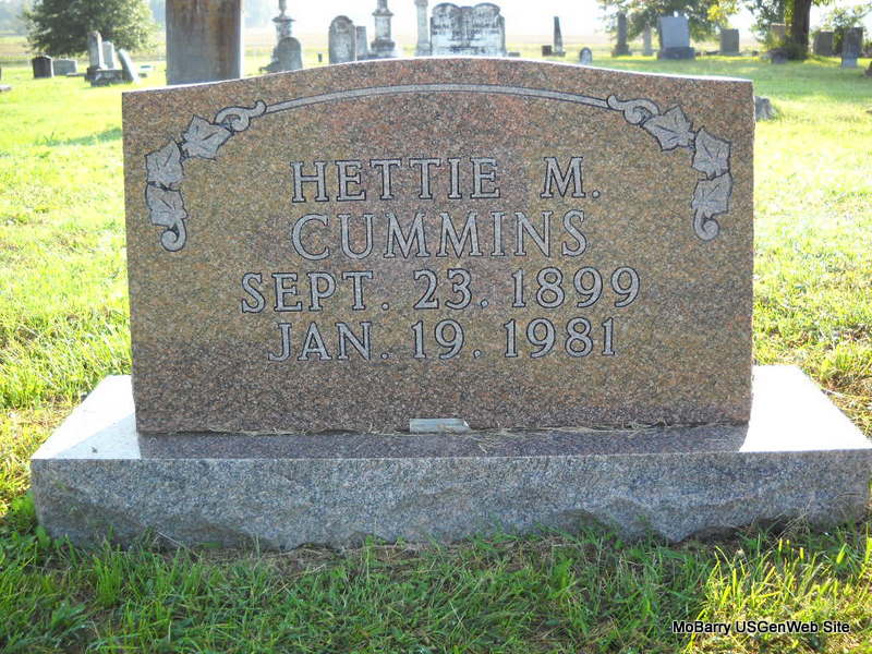 | CUMMINS, Hettie M. | Sept. 23, 1899 | Jan. 19, 1981 | Research Note: Jack posted that she died in 1982 - since the stone has 1981 the date was changed to read as the stone reads. Daughter of Elmer Rudolph Cummins and Anna May Carpenter. | Headstone Jack Delmar Census Phyllis Long Photo Donna Cooper Ted Roller |