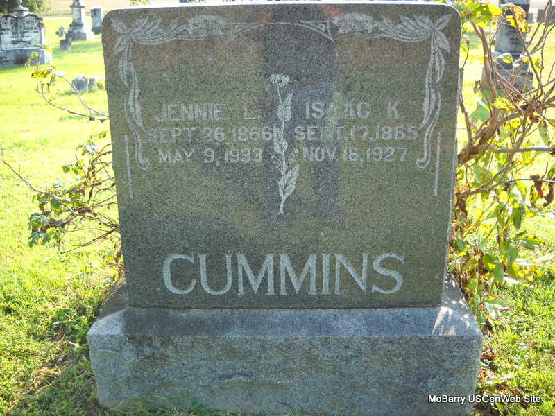 SSW: Jennie L. - Research Note: Husband of Jennie L. - Donna's Note: His death certificate reads that he was born Sept. 16, 1865 and not the 17th as Jack posted. The stone reads that he was born on the 17th. His father was Hiram J. Cummins, born VA, and his mother Katherine Kagy, born OH. Mr. Inles? Cummins, Pierce City, MO, was the informant. The cause of death was cerebral hemorrhage. | Headstone Jack Delmar Death Certificate Donna Cooper Photo Donna Cooper Ted Roller |
