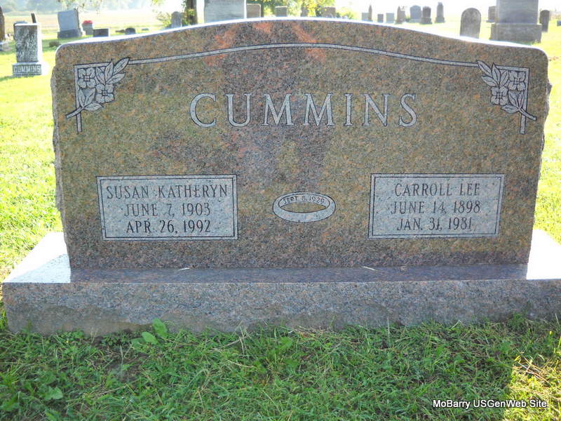 | CUMMINS, Carroll Lee | June 14, 1898 | Jan. 31, 1981 | SSW: Susan Katheryn - Inscription: "Sept. 8, 1929" - Research Note: Married Susan Katheryn Williams, Sept. 8, 1929. Son of Frank Lee Cummins and Celia Hortense Grimes. | Headstone Marriage Record Jack Delmar Census Phyllis Long Photo Donna Cooper Ted Roller |