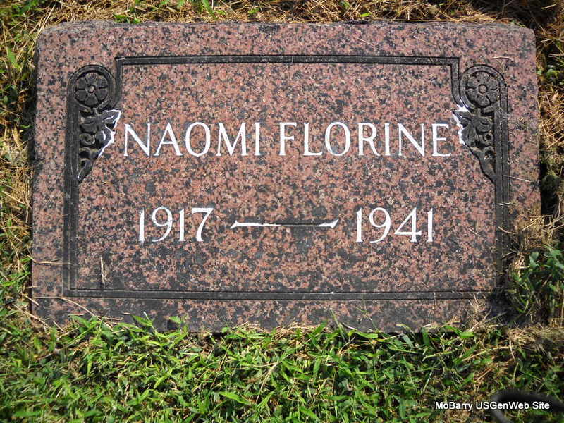 Research Note: Her death certificate reads that she was named Naomi Florene and the stone has her name spelled Florine - and that she died in 1941 - not in 1940 as her death certificate reads. C. O. Davis, born in Fairview, MO, was her father. Frances Davis, born in Newton Co., MO, was her mother. C. O. Davis, R. R. 2, Pierce City, MO, was the informant. | Death Certificate Photo Donna Cooper Ted Roller |