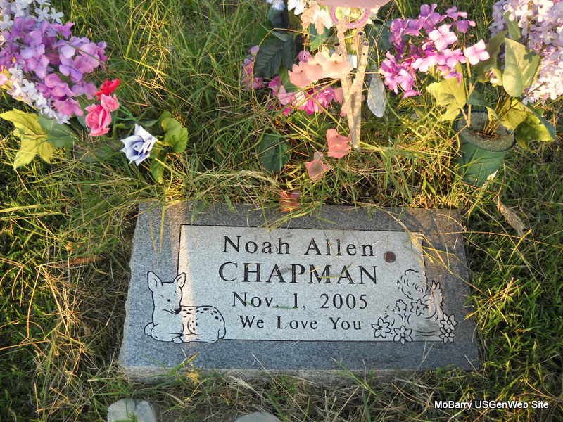 Inscription: "We Love You" - Research Note: Noah Allen Chapman, infant son of Chase and Megan (Wilson) Chapman of Aurora, died shortly after birth November 1, 2005, at Barnes Jewish Hospital in St. Louis. Graveside services were November 2 at Jolly Cemetery near Pierce City with Rev. Kerans officiating under the direction of Lakin Funeral Home of Pierce City. | Monett Times Nov. 7, 2005 Donna Cooper Photo Donna Cooper Ted Roller |