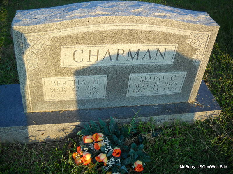SSW: Maro C. - Research Note: Maro C. Chapman, age 27, married Bertha A. Hill, age 19, on Sept. 3 1905 in Barry Co., MO. Daughter of John and Rosa Hill. - March 6, 1909, Cassville Democrat - Northwest Corner News: Will Gates of Purdy visited his cousin Mrs. Maro Chapman last week. | MO Marriage Records Online Newspapers Census Phyllis Long Photo Donna Cooper Ted Roller |