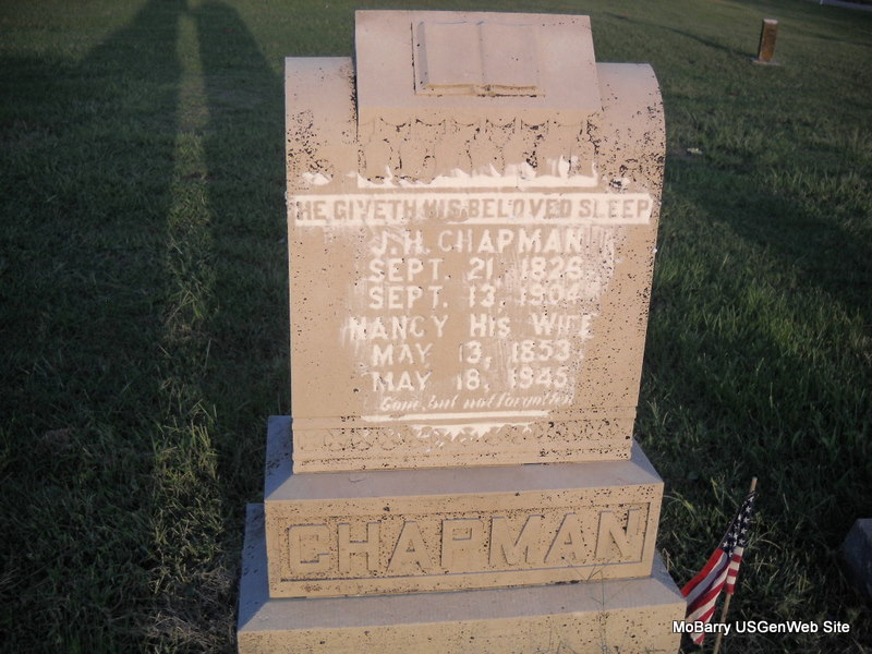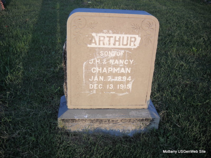 | CHAPMAN, Arthur | Jan. 7, 1894 | Dec. 13, 1915 | Inscription: "Son of J. H. & Nancy" | Photo Donna Cooper Ted Roller |