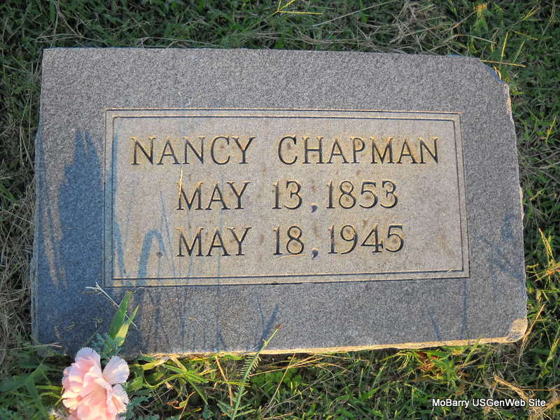 SSW: J. H. - Research Note: According to her death certificate she was widowed twice. Her father was Hiram? Trusler, born England, her mother was Nancy Trusler, born New York. The informant was Maro Chapman, Pierce City, MO. - Donna's Note: She was a daughter of George Trusler and Nancy P. Davis. Her mother was born in PA and her father in Surrey, England. First husband was George B. Bowers, married on Feb. 19, 1871 in Lawrence Co., MO. Nancy Bowers, age 23, married James H. Chapman, age 50 about 1876 in Cherokee Co., KS. Nancy filed for James' Civil War Pension on Dec. 21, 1904 from Barry Co., MO. - Another Stone | Death Certificate KS Marriage Index MO Marriage Records Phyllis Long Death Certificate Donna Cooper Photos Donna Cooper Ted Roller |