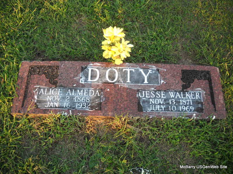SSW: Jesse Walker - Research Note: According to her death certificate she was a daughter of William Christopher and Frances Hisaw. Her husband was J. W. (Jesse Walker) Doty. Informant was Mrs. E??? House of Stark City, MO. J. W. Doty married Alice Christopher on Sept. 24, 1893 in Newton Co., MO. | Death Certificate MO Marriage Records Phyllis Long Photo Donna Cooper Ted Roller |