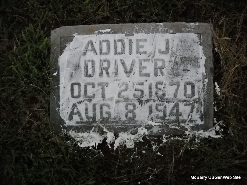 | DRIVER, Addie J. (PARMLEY) | Oct. 25, 1870 | Aug. 8, 1947 | Research Note: Wife of James M. Driver. Addie Parmley married James M. Driver on Mar. 23, 1892 in Newton Co. MO. - 1900 Census, Newtonia, Newton, Missouri - William H. Parmley, head, born Aug. 1844 IL, age 55, married 33 years, father born IL, mother KY, farmer; Louisa, wife, born Jan. 1843 IL, age 57, married 33 years, mother of 8 children, 7 living, father born KY, mother PA; John G., son, born Nov. 1874 IL, age 25, single; Thomas B., son, born Oct. 1882 MO, age 17; George H., has head but marked out (maybe brother?), born Feb. 1877 IL, age 23, single; William E., brother, born June 1879 IL, age 20 single; Addie J. Driver, sister, born Oct. 1870 IL, age 29, married 8 years, mother of 2 children, both living; Fannie M. Adams, cousin, born Feb. 1887 MO, age 13; Henry F. Tyson, nephew born Feb. 1890 MO, age 10; Emby Driver, nephew, born Aug. 1894 MO, age 5; Lula E., niece, born Feb. 1897 MO, age 3. | Census MO Marriage Records Phyllis Long Photo Donna Cooper Ted Roller |