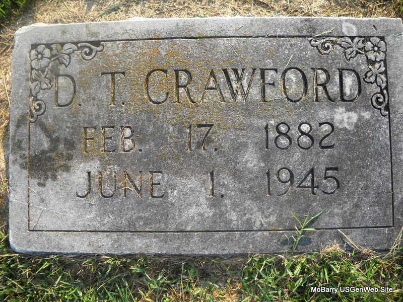 Research Note: According to his death certificate his name was Toliver Dotson Crawford and his wife was Rosa May Crawford and she was the informant. He was employed at Camp Crowder. He was a son of Sam and Martha Crawford, both born TN. Cause of death was brain hemorrhage. The death certificate has his name Toliver Dotson, but family says it was Dotson Toliver and that he went by Dot. | Death Certificate Phyllis Long Note Donna Cooper Photo Donna Cooper Ted Roller |