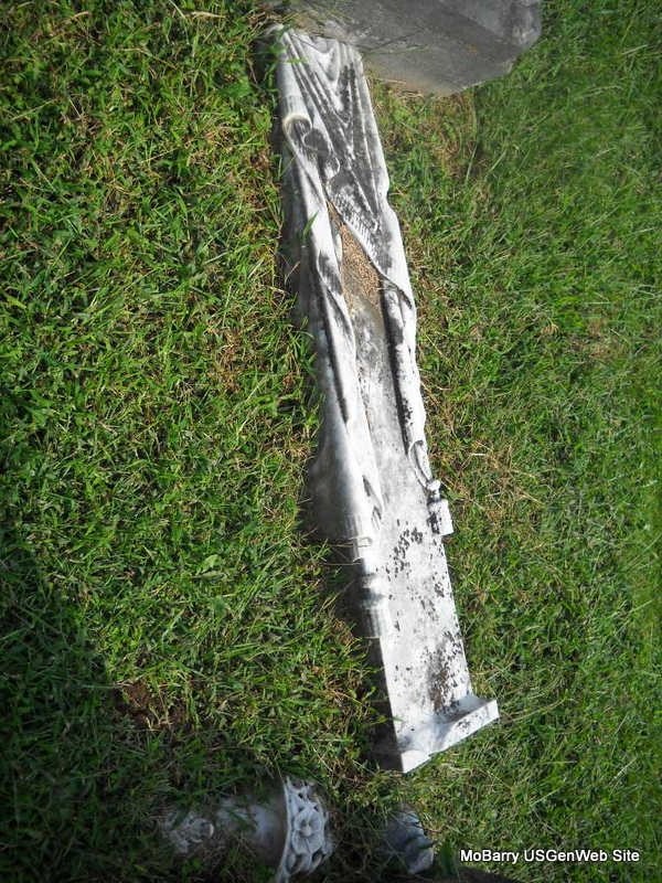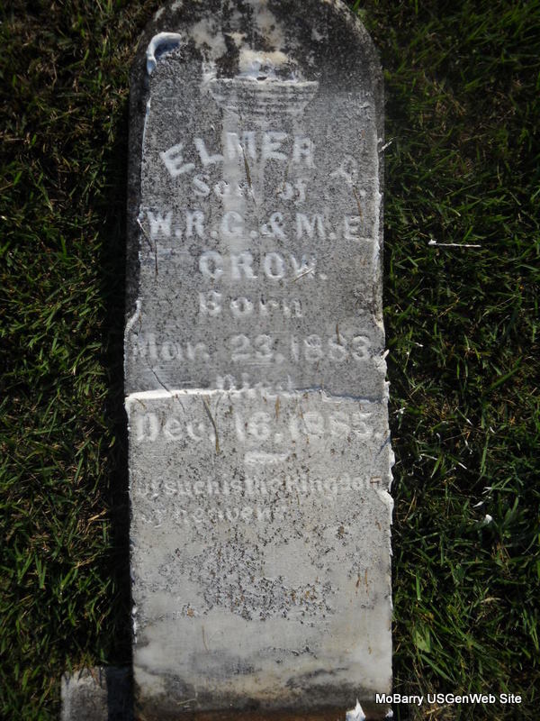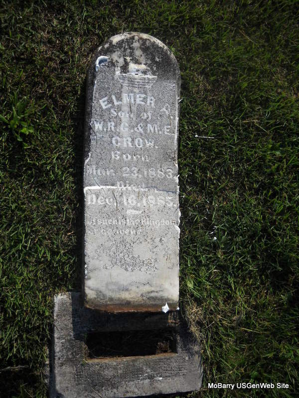 | CROW, Elmer A. | Mar. 23, 1883 | Dec. 16, 1885 | Inscription: "Son of W. R. G. & M. E." - Research Note: This stone is broken in half, and is off its base and flat, face up on the ground. Son of William R. G. and Mary Louise (McBride) Crow. - Another Photo | Census Phyllis Long Photos Donna Cooper Ted Roller |
