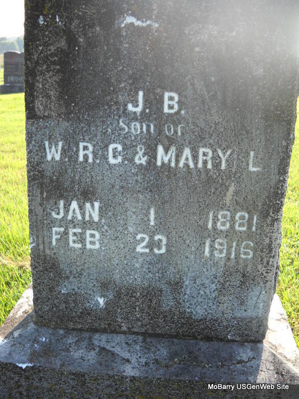 | CROW, John B. | Jan. 1, 1881 | Feb. 23, 1916 | Inscription: "Son of William R. G. & M. L." - Research Note: Son of William R. G. Crow and Mary L. McBride. | Census Phyllis Long Photo Donna Cooper Ted Roller |