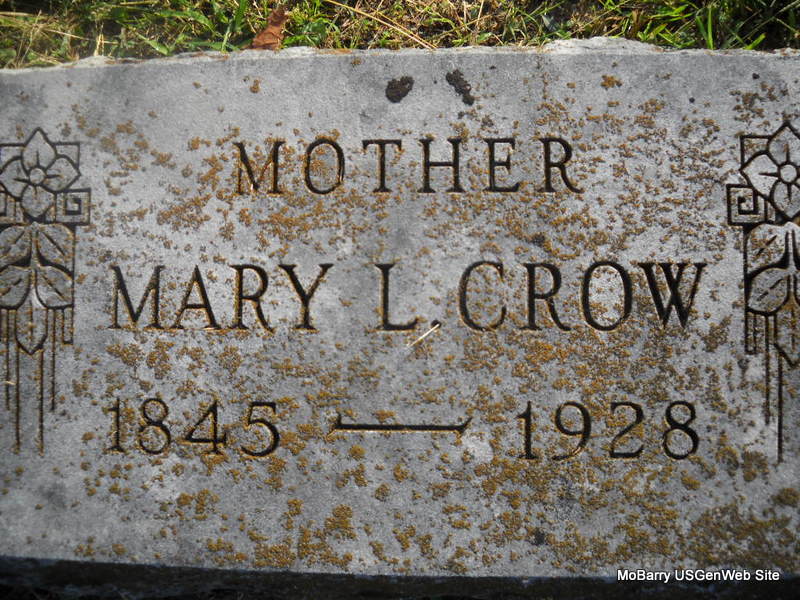 Inscription: "Mother" - Research Note: Her death certificate reads that Joseph McBride, born TN was her father, and May Williams, born TN, was her mother. She was a widow and the cause of death was chronic nephritis. Her husband was given as W. R. G. Crowe - spelling of Crowe is used. Grace Maples, Joplin, MO, was the informant. - William R. G. Crow and Mary L. are in Newtonia, Newton Co., MO in 1880 Census. Still there in 1900 Census. 1910 Census, Mary is widowed and in Newton Co., MO. | Death Certificate Donna Cooper Census Phyllis Long Photo Donna Cooper Ted Roller |