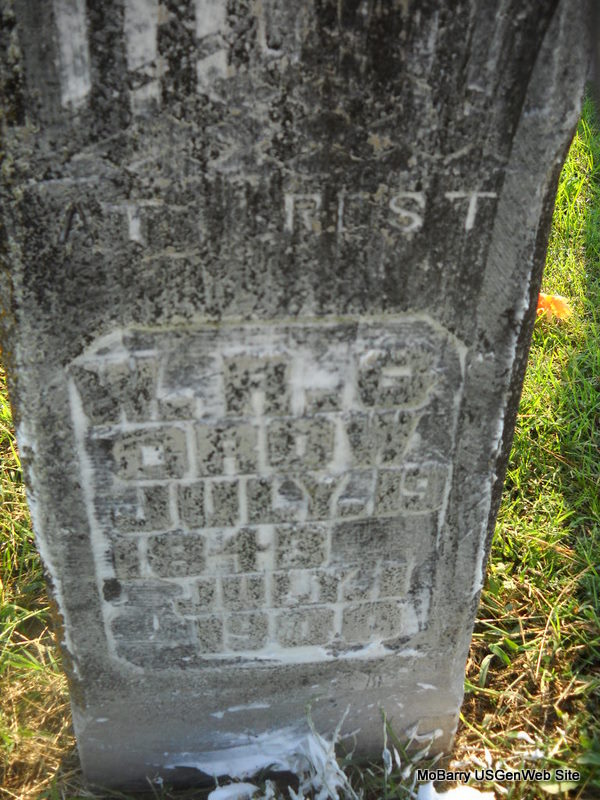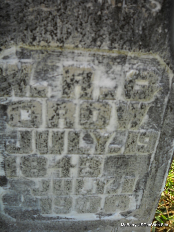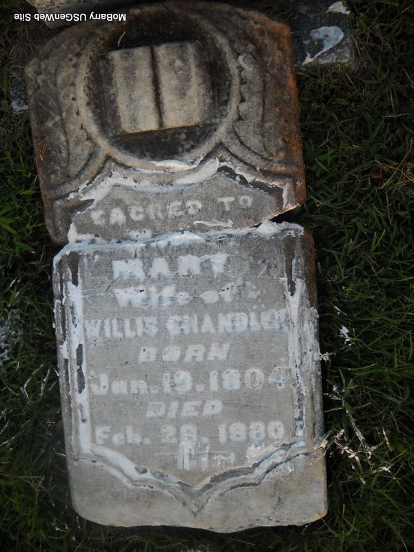 Feb. 28, 1880 | Inscription: "Wife of Willis" - Research Note: This stone is broken into two pieces and is flat on the ground. Next to her stone is an unmarked grave. Willis Chandler married Mary Jane Jessep on Mar. 18, 1866 in Greene Co., MO. | MO Marriage Records Phyllis Long Photo Donna Cooper Ted Roller |