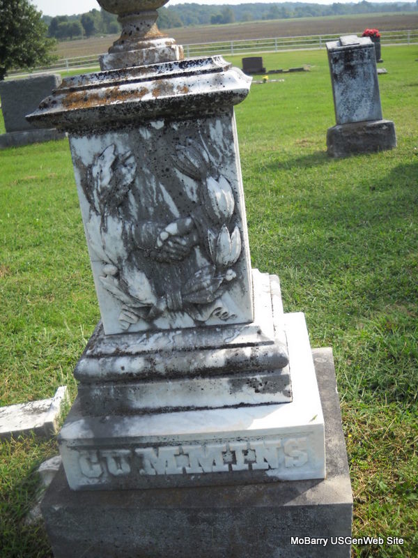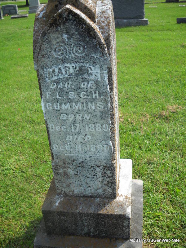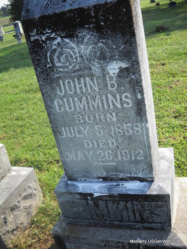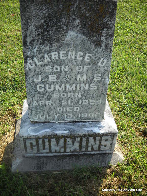 Inscription: "Son of J. B. & M. S. " - Research Note: He was a son of John B. and Mary Susan (Hisaw) Cummins. | Headstone Jack Delmar Note Phyllis Long Photo Donna Cooper Ted Roller |