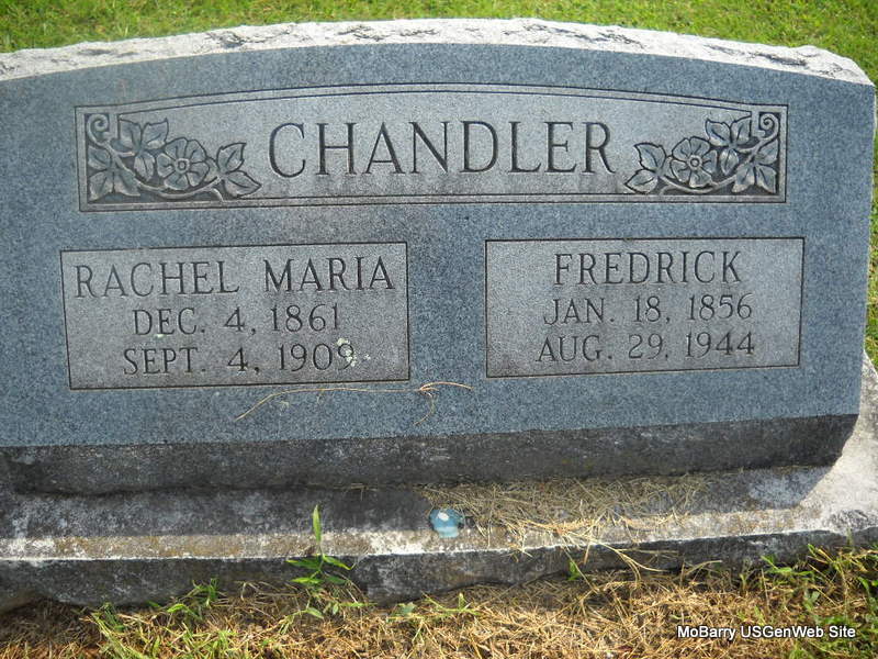 | CHANDLER, Rachel Maria (CUMMINS) | Dec. 4, 1861 | Sept. 4, 1909 | SSW: Frederick - Research Note: Rachel M. Cummins married Fred Chandler on Jan. 9, 1881 in Newton Co., MO. Daughter of Hiram J. Cummins and Catherine Kagy. | MO Marriage Records Census Phyllis Long Photo Donna Cooper Ted Roller |