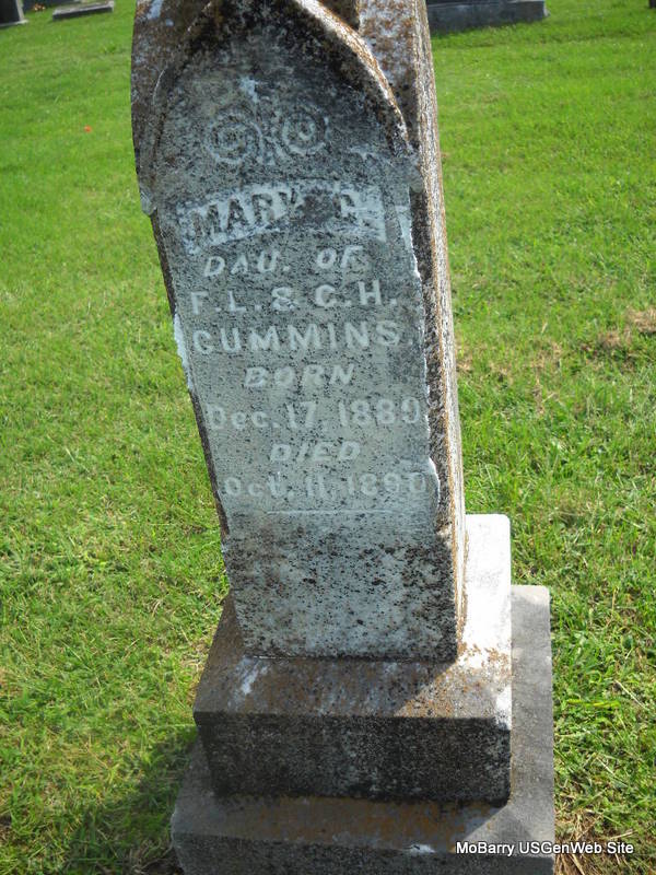 | CUMMINS, Mary C. | Dec. 17, 1889 | Oct. 11, 1890 | Inscription: "Dau. of F. L. & C. H." - Research Note: Daughter of Frank Lee Cummins and Celia Hortense Grimes. - Another Photo | Note Phyllis Long Photos Donna Cooper Ted Roller |