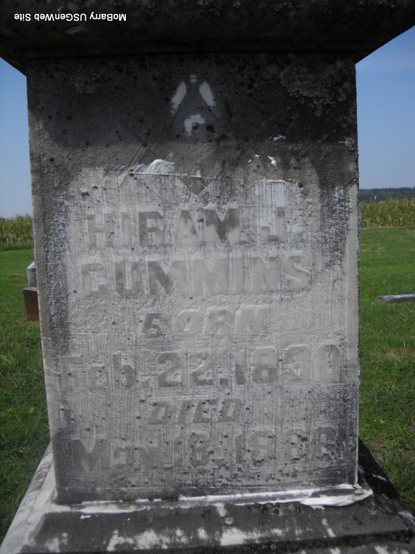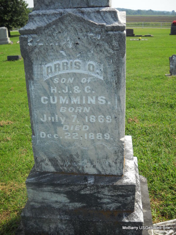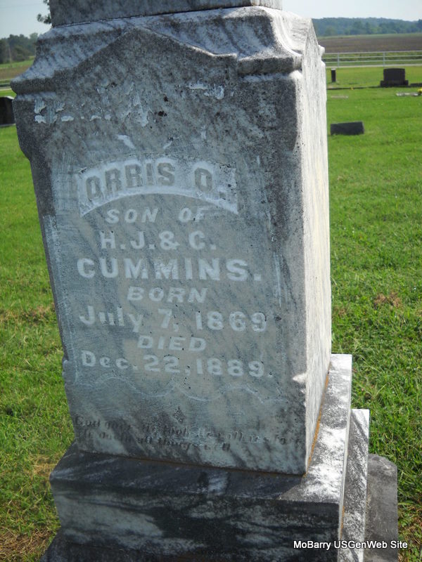 | CUMMINS, Orris Otis | July 7, 1869 | Dec. 22, 1889 | Inscription: "Son of H. J. & C." - Research Note: Son of Hiram J. Cummins and Catherine Kagy. - Another Photo - Another Photo - Another Photo | Headstone Jack Delmar Census Phyllis Long Photos Donna Cooper Ted Roller |