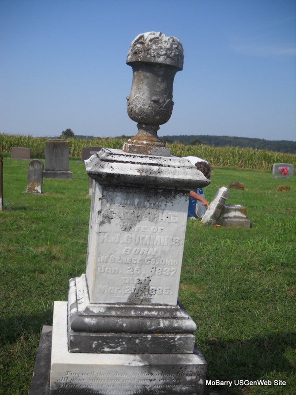 Inscription: "Born in Seneca Co., Ohio" - Research Note: Wife of Hiram J. Cummins, married November 22, 1885. This is my gg grandmother. Daughter of John Kagy and Catherine Hite. Jack posted that she died on the 25th - stone has 20th. This stone is broken - the two top pieces have fallen to the ground. - Another Photo - Another Photo - Another Photo - Another Photo | Headstone Note Jack Delmar Photos Donna Cooper Ted Roller |