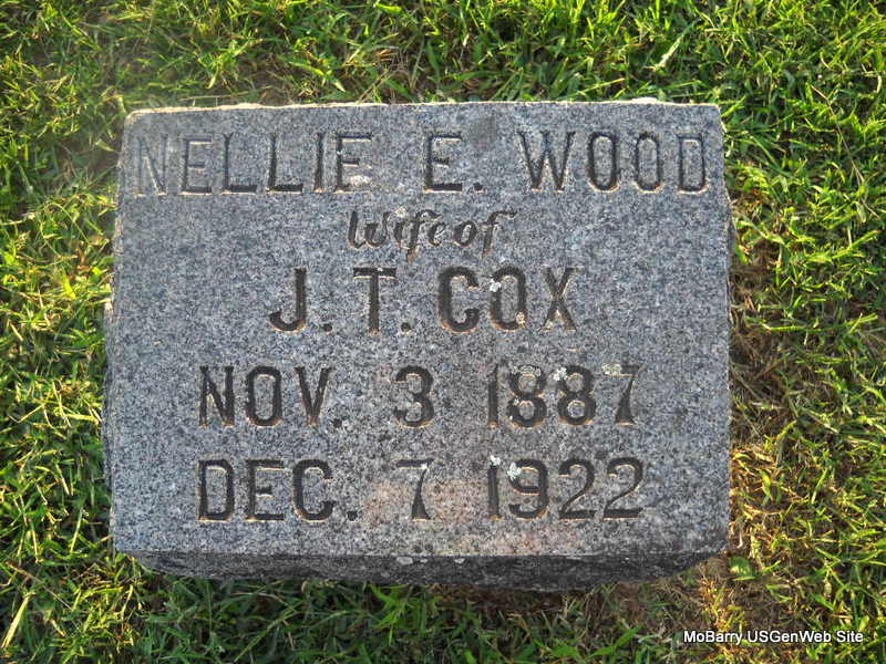 | COX, Nellie E. (WOOD) | Nov. 3, 1887 | Dec. 7, 1922 | Inscription: "Wife of J. T. Cox" - Research Note: Daughter of James C. Wood. - 1900 Census, Newtonia, Newton, Missouri - James C. Wood, lodger, born July 1864 AR, age 35, widowed, farmer, father born VA, mother TN; Nellie E., lodger, born Nov. 1887 MO, age 12, father born AR, mother MO; Daisy J., lodger, born June 1891 MO, age 8, father born AR, mother MO; living with Teresa Furguson, head, born Nov. 1828 VA, single, parents born VA, farmer; Emily E. Furguson, sister to Teresa, born July 1833 VA, age 66, parents born VA. | Census Phyllis Long Photo Donna Cooper Ted Roller |
