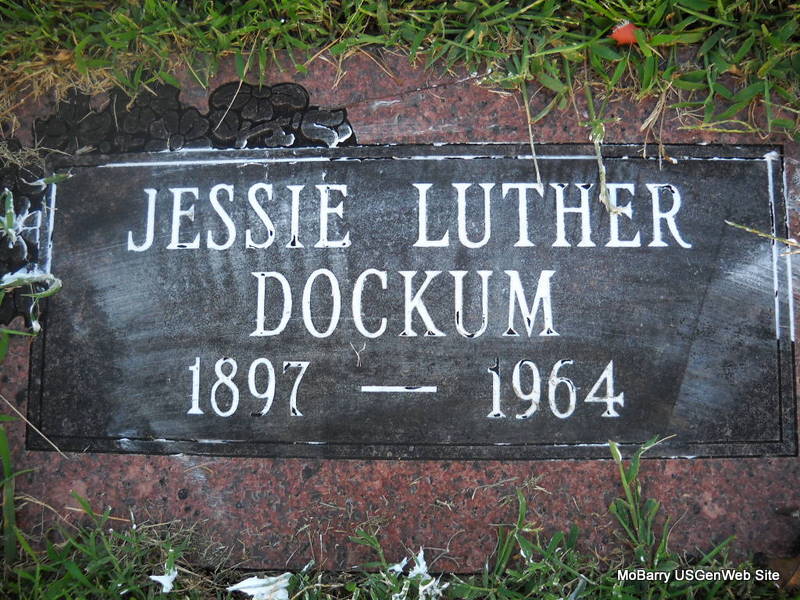 Research Note: He is buried next to Ella Dockum Robinson. Son of John S. Dockum and Hulda Ellen "Ella" (Wilson) (Dockum) Robinson. Maggie Jones of Joplin, MO was the informant on the death certificate. WW I Draft Reg. from Harper Co., OK. Working for his brother Arthur Dockum. Nearest relative was John S. Dockum of May, Harper Co., OK. - 1900 Census, Union, Benton, Missouri - John S. Dockum, born Mar. 1863 IL, age 37, married 9 years; Ella, wife, born Nov. 1868 MO, age 29, married 9 years; Cashes, son, age 7, born Feb. 1893 MO; Maggie, daughter, born Feb. 1894 MO, age 6; Luther, son, born Nov. 1897 MO, age 2; Arthur, son, born Aug. 1899, age 4 months. - 1910 Census, Irwin, Woodward, Oklahoma - John S. Dockum, age 47; Huldy M. E., age 38; Bennie Cashes, age 17; Maggie M., age 16; Jessie L., age 12; Arthur L., age 10, Honor E. N., age 4. - 1920 Census, Otter, Harper, Oklahoma - John S. Dockum, age 55, born IL; H. Ella C., wife, age 48, born MO; J. Luther, son, age 22, single, born MO; Honor W., daughter, age 14, born OK; Russell W., son, age 12, born OK; Jonathan T. Wilson, father-in-law, age 86, born OH, father born Wales, mother Maryland; Mary A., mother-in-law, age 81, born IN, father born U. S., mother KY. - 1930 Census, Benton, Beaver, Oklahoma - living with wife and her family - Albert H. Redimer, head, age 38, born OK, father born Germany, mother IL, farmer; D. Talmade Redimer, brother, age 36, born OK; George Redimer, father, age 74, born Germany; Margie Dockum, sister to Albert H. Redimer and wife to Jessie L. Dockum, age 33, born KS; Jessie L., brother-in-law to Albert H. Redimer and wife to Margie, age 32, born MO; Marie B. Dockum, niece and daughter to Jessie L. age 5, born OK; Jessie L. Dockum Jr., nephew to Albert H. Redimer, age 3, born OK. - 1930 Census, Benton, Beaver, Oklahoma - J. Luther Dockum, head, age 40, divorced, born MO, residence in 1930 was Beaver, OK, farmer on rented farm. - Parents John S. and Hulda Dockum are in Pasadena, Los Angeles, California in the 1930 census. | Death Certificate Census Phyllis Long Photo Donna Cooper Ted Roller |