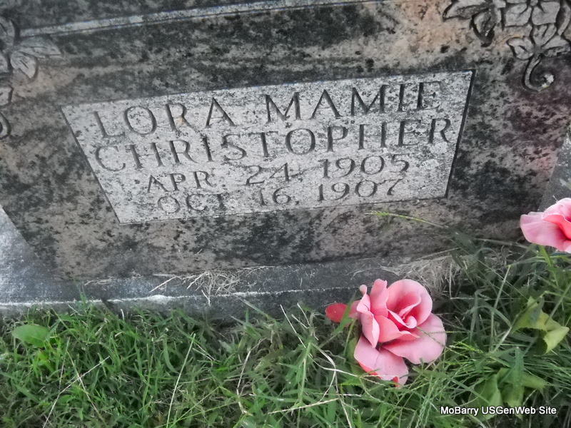 | CHRISTOPHER, Lora Mamie | Apr. 24, 1905 | Oct. 16, 1907 | Research Note: Daughter of Jerry Christopher and Maggie Fisher. | Note Phyllis Long Photo Donna Cooper Ted Roller |