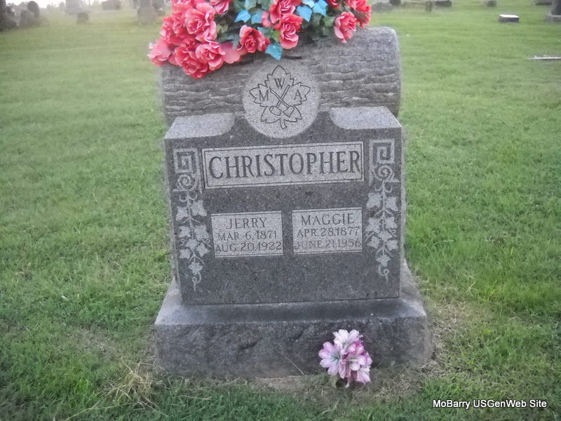 | CHRISTOPHER, Jeremiah "Jerry" | Mar. 6, 1871 | Aug. 20, 1922 | SSW: Maggie - Research Note: Son of William Christopher and Frances Jane Hisaw. Frances first married William Henry Walker. She second married William Christopher on July 26, 1866 in Barry Co., MO. William Walker could have possible died in the Civil War. - 1880 Census, Capps Creek Twp., Barry Co., Missouri - Frances Christopher, female, widowed, age 40, born TN; Alice, daughter, age 12, born MO; Jeremiah, son, age 9, born MO; Hulda, daughter, age 6, born MO; Mary Walker, daughter, age 18, born MO. | Census MO Marriage Records Phyllis Long Photo Donna Cooper Ted Roller |
