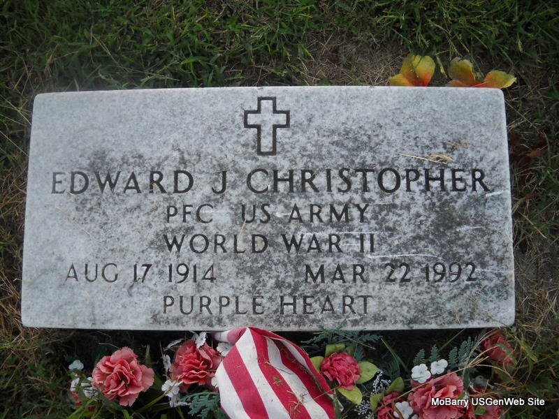 | CHRISTOPHER, Edward J. | Aug. 17, 1914 | Mar. 22, 1992 | Inscription: "PFC US ARMY - PURPLE HEART" - Research Note: Son of Jeremiah "Jerry" Christopher and Margaret "Maggie" Abigail Fisher. | Census Phyllis Long Photo Donna Cooper Ted Roller |