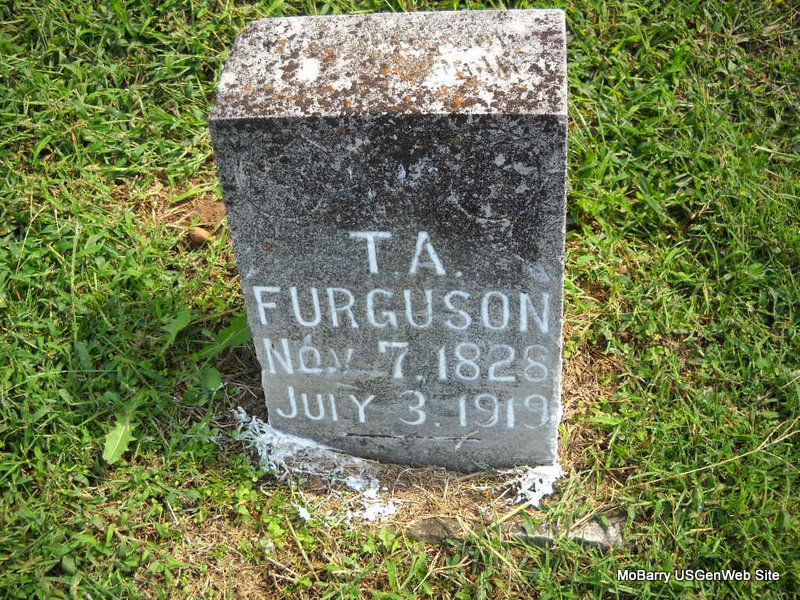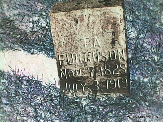 Research Note: Headstone has T. A. Furguson - normally spelled Ferguson. Daughter of John Davis Ferguson/Furguson and Rhoda H. Rogers. - 1900 Census, Newtonia, Newton, Missouri - Teresa Furguson, head, born Nov. 1828 VA, single, parents born VA, farmer; Emily E. Furguson, sister to Teresa, born July 1833 VA, age 66, parents born VA; James C. Wood, lodger, born July 1864 AR, age 35, widowed, farmer, father born VA, mother TN; Nellie E., lodger, born Nov. 1887 MO, age 12, father born AR, mother MO; Daisy J., lodger, born June 1891 MO, age 8, father born AR, mother MO. - Another Photo | Headstone Photo Nancy Wickam Census Phyllis Long Photo Donna Cooper Ted Roller |