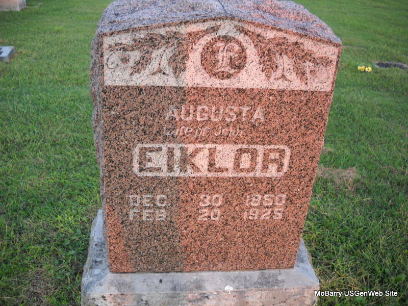 Inscription: "Wife of John" - Research Note: Her death certificate reads that John Eiklor was her (second) husband, and she was widowed. The cause of death was influenza. She was age 74 years, 1 month and 20 days old when she died. Her father's name was Johnson and her mother was Amanda Hawkins. The birth places of both was unknown to the informant, G. W. Hunsucker, Sarcoxie, MO. She was buried in Jolly Cemetery, Feb. 22, 1925. Augusta first married James Hunsucker or Huntsucker. She married John Eiklor on Aug. 31 1886 in Newton Co., MO. | Death Certificate Donna Cooper MO Marriage Records Phyllis Long Photo Donna Cooper Ted Roller |