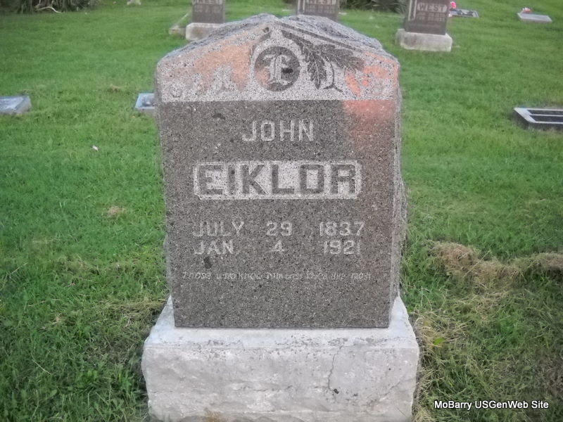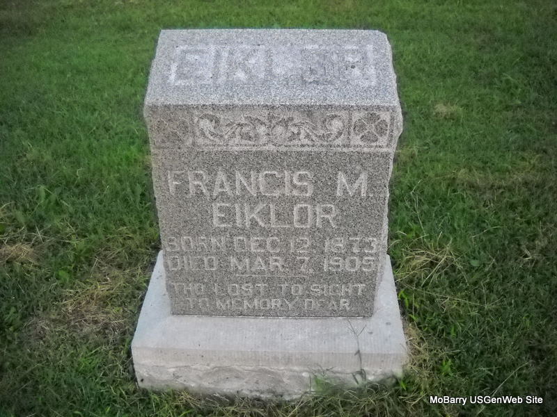 | EIKLOR, Francis M. | Dec. 12, 1873 | Mar. 7, 1905 | Research Note: Son of John Eiklor and Jerusha Ricketts. Francis M. Eiklor married Annie Mulvaney on Apr. 22, 1899 in Newton Co., MO. - 1900 Census, Newtonia, Newton, Missouri - Francis Eiklor, head, house 3732, born Dec. 1873 MO, age 26, married 1 year, parents born IN, farmer; Annie M., wife, born Nov. 1882 MO, age 17, no children, parents born MO; Mary L. Mulvaney, head, house 3733, born Oct. 1857 MO, age 43, widowed, mother of 6 children, 5 living, father born TN, mother MO, farmer; John W., son, born May 1877 MO, age 23; Charles E., son, born May 1884 MO, age 16. | MO Marriage Records Census Phyllis Long Photo Donna Cooper Ted Roller |