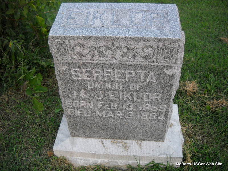 | EIKLOR, Serrepta | Feb. 13, 1869 | Mar. 2, 1884 | Inscription: "Dau. of J. & J." - Research Note: Daughter of John Eiklor and Jerusha Ricketts. | Note Phyllis Long Photo Donna Cooper Ted Roller |