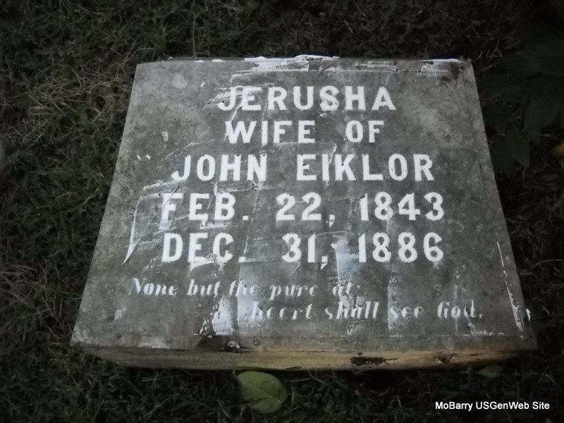 | EIKLOR, Jerusha (RICKETTS) | Feb. 22, 1843 | Dec. 31, 1886 | Inscription: "Wife of John" - Research Note: This stone is flat on the ground and appears to be broken and off its base. John Eiklor married Jerusha Ricketts on Jan. 23, 1860 in IN. Daughter of James Ricketts and Jane Stropes. - Another Photo - Pieces of the stone | IN Marriage Index Census Phyllis Long Photos Donna Cooper Ted Roller |