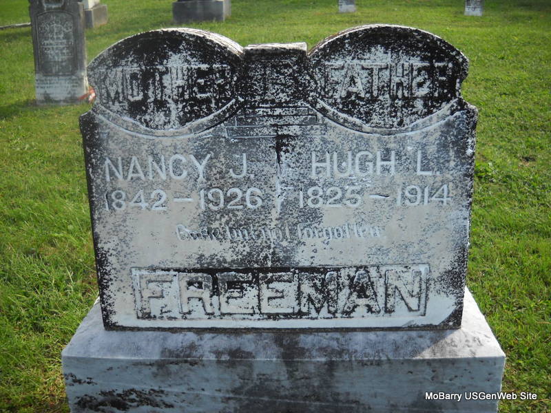 SSW: Nancy J. - Inscription: "Father" - Research Note: According to his death certificate his occupation was a blacksmith. He was a son of William Freeman, born Ireland, and Mary Ann Norrel, born TN. J. M. Freeman of Newtonia, MO, was the informant. - Hugh L. Freeman first married Phoebe England on Mar. 1, 1852 in Claiborne Co., TN. He second married Miss Nancy Jane Kelly on Oct. 4, 1875. | TN Marriage Index MO Marriage Records Phyllis Long Death Certificate Phyllis Long Photo Donna Cooper Ted Roller |