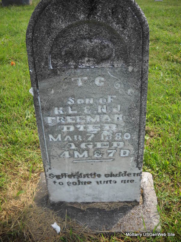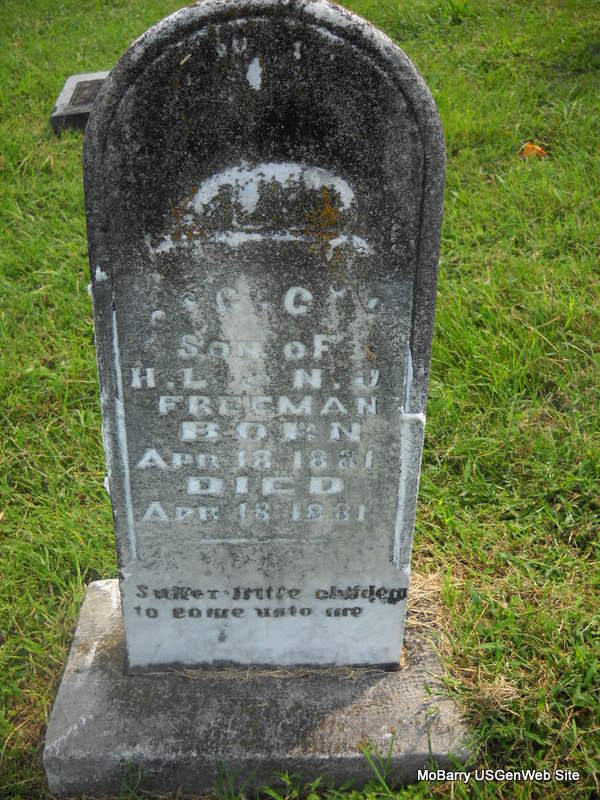 | FREEMAN, T. C. | 1879 | Mar. 7, 1880 | Inscription: "Son of H. L. & N. J. - Aged 4 M. 7 D." - Research Note: Son of Hugh L. Freeman and Nancy Jane Kelly. | Note Phyllis Long Photo Donna Cooper Ted Roller |
