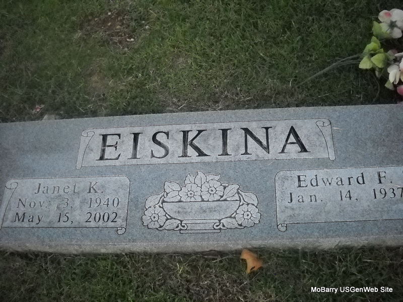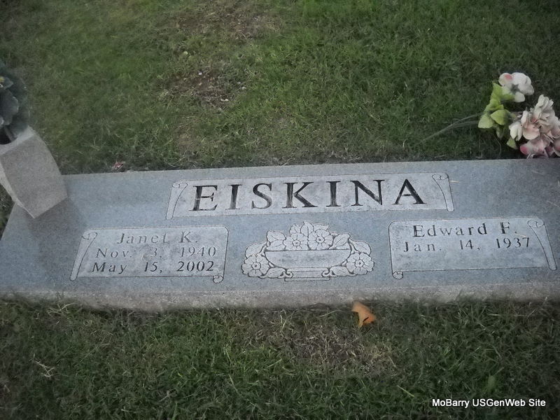 SSW: Janet K. - Research Note: He was the son of John and Anna (Smith) Eiskina. Ed, as he was known, was married to Janet Wise on July 5, 1959, in Miami, OK. Mrs. Eiskina preceded him in death on May 15, 2002. Retiring from the Kansas City Terminal Railroad System in Kansas City, MO after working there from 1956 until 1997, Ed moved back to the farm where he was born and started farming and growing big tomatoes. Surviving are the following: two daughters; three sons; and ten grandchildren. Edward's parents are buried at St. Peter and Paul Cemetery, Pulaskifield, Barry Co., MO. | Lakin Funeral Home Phyllis Long Photo Donna Cooper Ted Roller |
