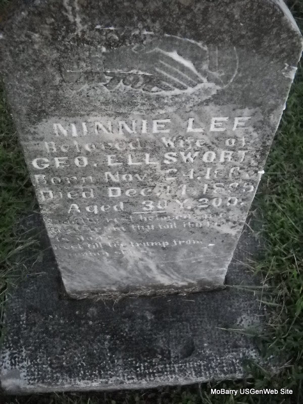 | ELLSWORTH, Minnie Lee (BOURLAND) | Nov. 24, 1865 | Dec. 14, 1895 | Inscription: "Wife of Geo. E. - Aged 30 Y. 20 D." - Research Note: George Ellsworth married married his first wife Minnie L. Bourland on Oct. 2, 1888 in Newton Co., MO. Daughter of James W. Bourland and Mary Wheeler Teele, both buried in this cemetery. | MO Marriage Records Phyllis Long Photo Donna Cooper Ted Roller |