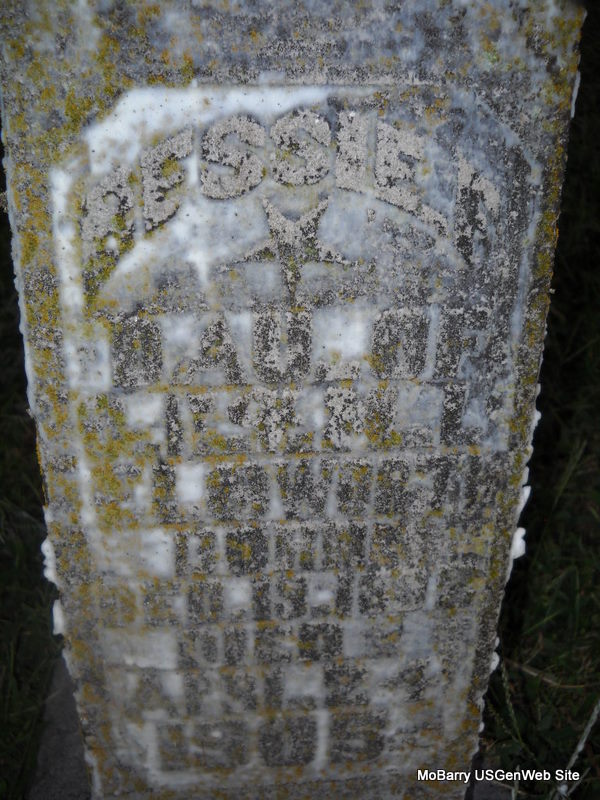 | ELLSWORTH, Bessie | Dec. 19, 1882 | Apr. 24, 1905 | Inscription: "Dau. of G. E. & M. L." - Research Note: Daughter of George Ellsworth and Minnie Lee Bourland. | Census Phyllis Long Photo Donna Cooper Ted Roller |