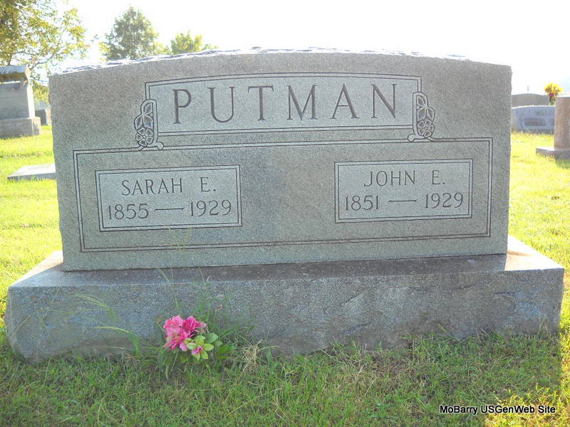 SSW: John E. - Research Note: Her death certificate reads that she was married, daughter of L. C. Grimes, born MO, and mother's maiden name was Sharp. Hortense Young (daughter) of Willard, MO, was the informant. - Wife of John Ezekiel Putman. Mother of 17 children, 13 living when she died. Daughter of Celia Sharp and Lewis Chrisman Grimes. Celia/Sela Sharp married Lewis C. Grimes on Dec. 5, 1854 in Claiborne Co., TN. Lewis Chrisman Grimes died in 1881 and is buried in Wright Cemetery, Fairview, Newton Co., MO. Celia is buried at Bethel Jolly Cemetery. | Death Certificate TN Marriage Index Phyllis Long Photo Donna Cooper Ted Roller |