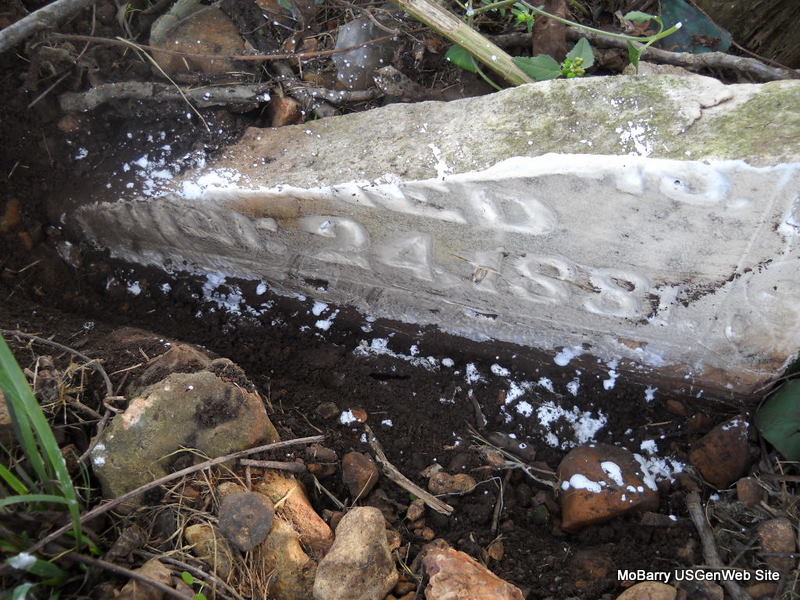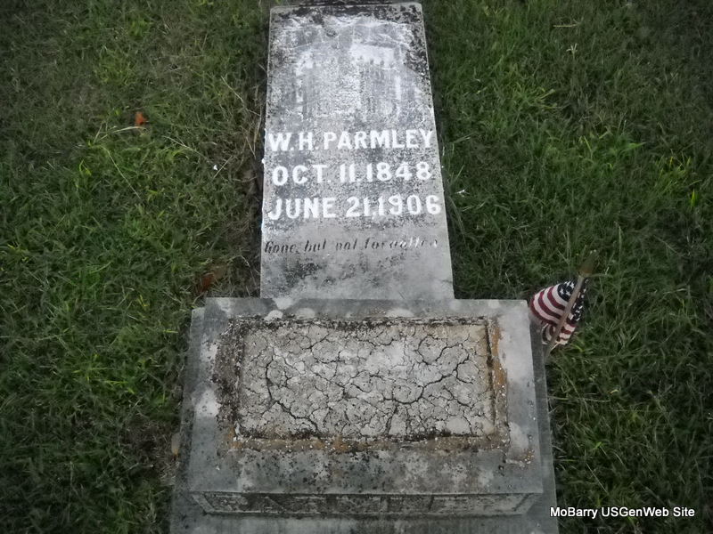 Research Note: This stone is broken off its base and is flat on the ground. Civil War Veteran. William Parmley married Louisa Bridges on Apr. 29, 1866 in Lawrence Co., MO. William H. Parmley, invalid, filed for his Civil War pension on Mar. 9, 1886 from MO. He served in K Co., 15th MO Cav. Louisa Parmley filed for his widow's pension on Aug. 27, 1906 from MO. She was the daughter of Henry and Eveline (Slankard) Bridges. - 1880 Census, Newtonia, Newton, Missouri - W. H. Parmley, age 34, born IL; Louisa, age 38, wife, born IL; Sarah, age 12, daughter, born MO; Addie, age 10, daughter, born IL; Susan, age 7, daughter, born IL; John G., age 5 son, born IL; George, age 3, son, born IL; William E., age 11 months, born IL. - 1900 Census, Newtonia, Newton, Missouri - William H. Parmley, head, age 55, born IL, married 33 years, father born IL, mother KY, farmer; Louisa, wife, married 33 years, born IL, mother of 8 children, 7 living, father born KY, mother PA; John G., son, born Nov. 1874 IL, age 25, single; Thomas B., son, born Oct. 1882 MO, age 17, single. - William has died - 1910 Census, Twp. 7, Craig, Oklahoma - John Parmley, head, age 34, married for 3 months, born IL; Maude, wife, age 30, married twice, married 3 months in present marriage, mother of 3 children, 3 living (children are not with them), born KS; Louisa, mother, age 66, widowed, mother of 8 children, 7 living, born IL; George, brother age 31, born IL, single. - Louisa is probably buried in OK. | MO Marriage Records Civil War Pensions Census Phyllis Long Photo Donna Cooper Ted Roller |