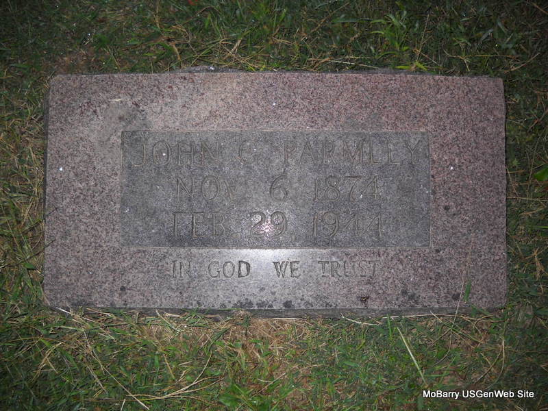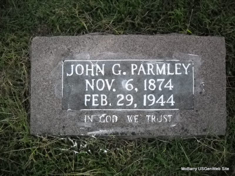 | PARMLEY, John G. | Nov. 6, 1874 | Feb. 29, 1944 | Inscription: "In God We Trust" - Research Note: Son of William H. Parmley and Louisa Bridges. - 1910 Census, Twp. 7, Craig, Oklahoma - John Parmley, head, age 34, married for 3 months, born IL; Maude, wife, age 30, married twice, married 3 months in present marriage, mother of 3 children, 3 living (children are not with them), born KS; Louisa, mother, age 66, widowed, mother of 8 children, 7 living, born IL; George, brother age 31, born IL, single. 1940 Census, Locust Grove, Mayes, Oklahoma - John G. Parmley, age 65, born IL; Maude E., wife, age 59, born KS. - Another Photo | Census Phyllis Long Photos Donna Cooper Ted Roller |